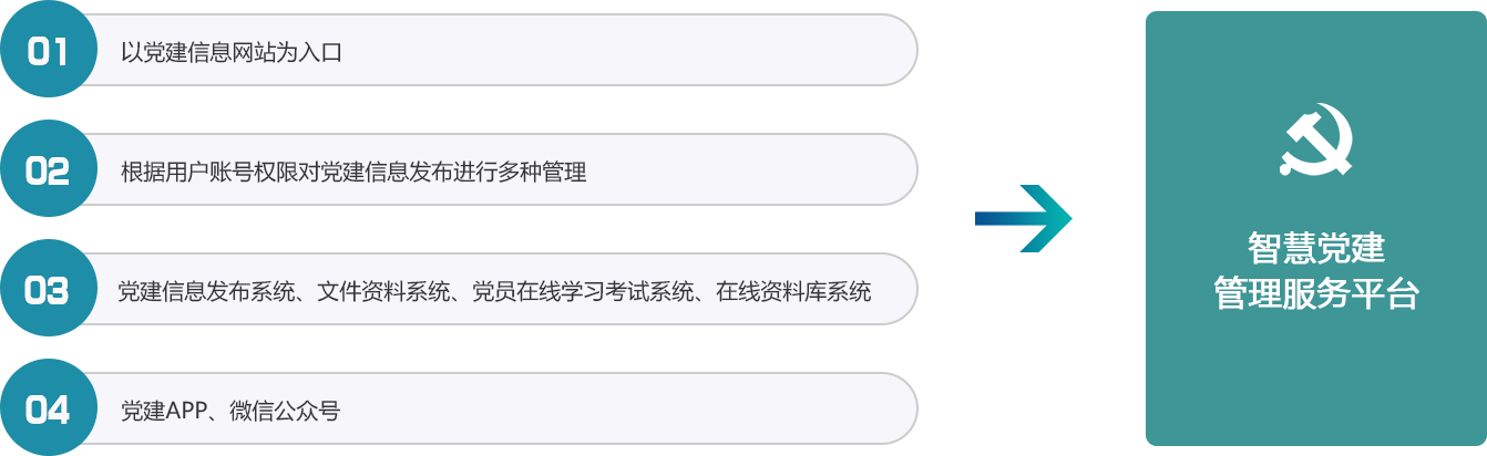 智慧党建管理服务平台以党建信息网站为入口,根据用户账号权限对党建信息发布系统、文件资料系统、党员在线学习考试系统、在线资料库系统、党建APP、微信公众号及后台管理系统进行管理,运用现代信息技术,增强基层党组织和党员的智慧力,实现机关党建工作的智能化、便捷化和高效化。